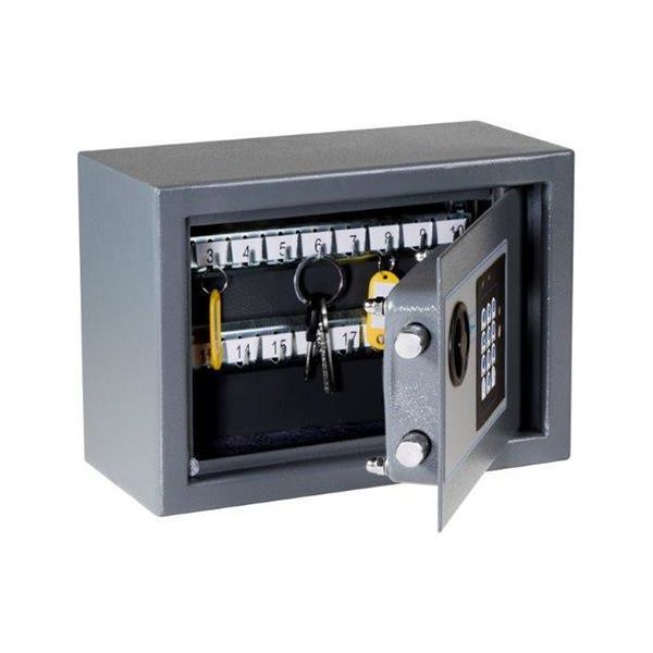 Stöldskyddande småskåp på 200 x 280 x 130 mm i solid stålplåt med elektroniskt kodlås och nödnyckel. Skåpen är förberedda att förankras i vägg. Dörren låses med tjockare reglar i sidan och har ett elektroniskt kodlås och handvred. Standardfärg är grafitgrå. AA batterier.