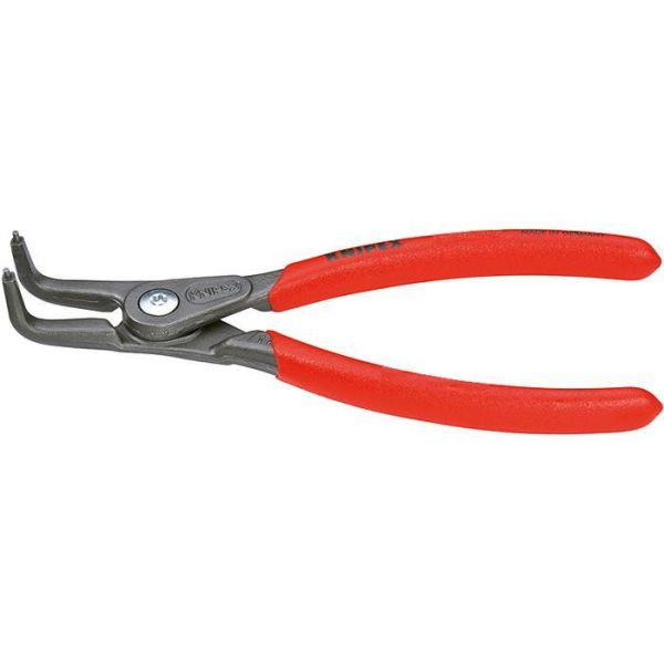 Precisionslåsringstång med böjda spetsar för ytterringar på axlar. Formlåsande isatta och pressade spetsar av högkomprimerat fjäderstål ger hög säkerhet mot överbelastning, t ex vid demontering av fastsittande ringar. Stora anliggningsytor och spetsarnas läge försvårar för ringarna att hoppa av.