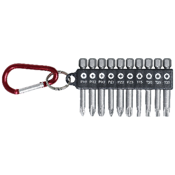 En praktisk och funktionell bitssats i 10 delar. Innehåller de vanligaste bitstyperna och är försedd med praktisk nyckelring.
