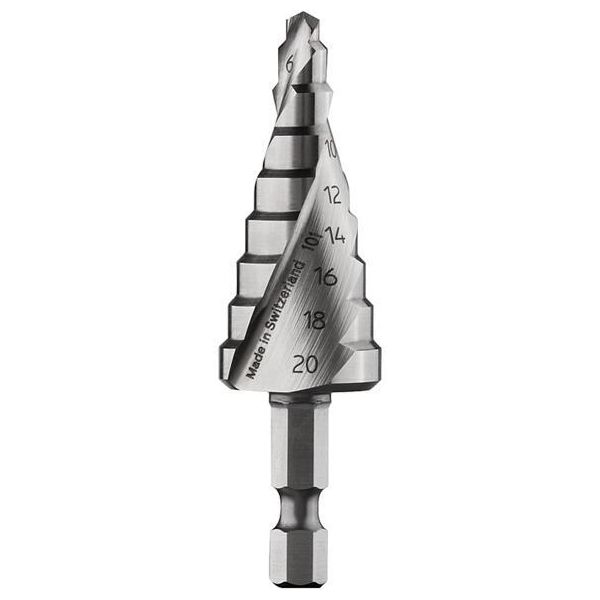 Stegborr med sexkantskaft i plastförpackning. Med 9 steg från Ø 4-20 mm.