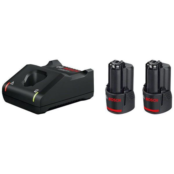 Ett laddpaket från Bosch innehållandes 2 stycken 12V 3,0Ah litiumjonbatterier och snabbladdaren GAL 12V-40.