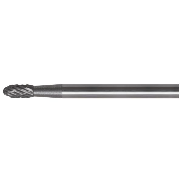 Roterande fil med spetsad form och rundad topp. För avgradnings- och formbearbetning.