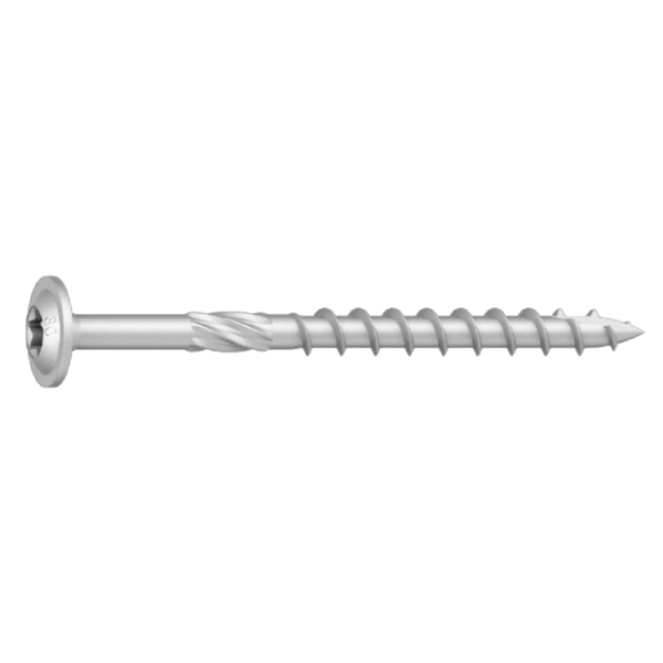 Träskruv på Ø6 mm som är tillverkad av härdat kolstål med C4-klassad ytbehandling, avsedd för användning utomhus som med fördel ersätter fransk träskruv. Stort brickhuvud för bättre genomdragningsvärden.