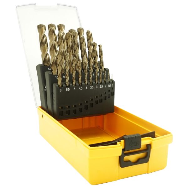 Borrkassett med transparent lock, med 25 st.slipade högkvalitativa snabbstålsborrar. HSS 5% Cobolt. Hög prestanda och mycket god centrering. Precisionsstart, inget behov av förborrning. Penetrerar snabbt och kräver mindre ansträngning/matartryck. Konstruerade för borrning i stål, legerat och olegerat stål, gjutjärn, icke järnhaltiga metaller, plats och andra material. För borrning i rostfritt använd lägre hastighet och högre matartryck samt gärna någon form av kylning.