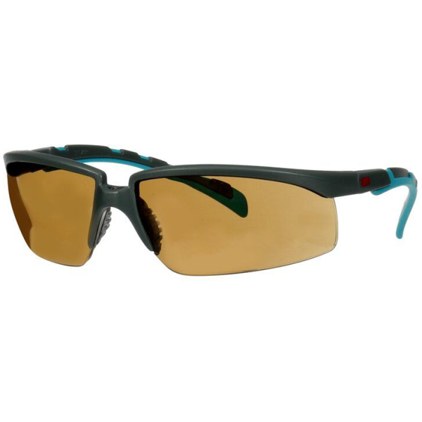 Skyddsglasögon med en blå/grön skalm, brun lins och anti-fog skydd. Detta ger ett exceptionellt bra skydd mot imma och repor på linsen i tuffa arbetsförhållanden.