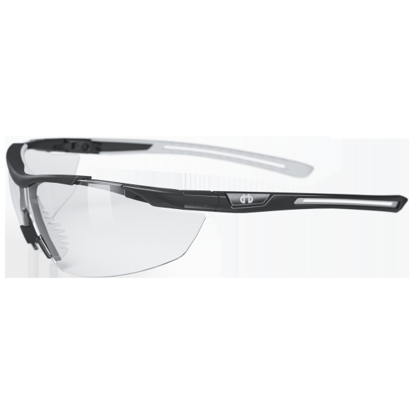 Avancerade skyddsglasögonen med klar lins och skalmar som har trestegsjustering för säker och åtsittande passform. Det dubbla materialet i skalmar och näsbrygga ger ökad komfort och förbättrat grepp oavsett användningsområde.
